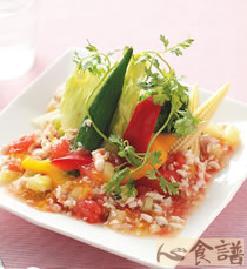 材料 主料:黄瓜100克,粉皮75克。香菜30克,胡萝卜,球形生菜各50克,黄椒,红椒各25克。,调料:盐1克,味精2克。酱油25克.米醋15克,精油5克,麻油4...