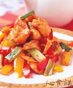 材料 白煮猪肚500克,青椒,红椒各250克,葱花,盐,料酒,味精,花生油,水淀粉...