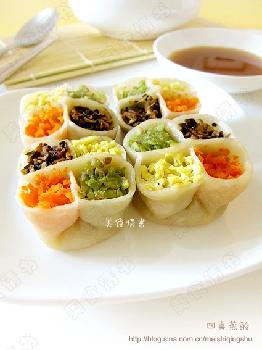 材料 中筋面粉250公克,滚水130公克,盐少许,糖少许,鸡蛋4颗,红萝卜丁20公克,玉米粒50公克,青豌豆20公克,青葱末少许,火腿12片,盐少许...