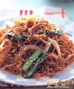 材料 细米粉1/2包,烧鸡肉80公克,火腿2片,韭菜30公克,银芽80公克,蒜末1/2茶匙,熟白芝麻少许,水100㏄,蚝油1大匙,酱油1茶匙,糖1/2茶匙,胡椒粉1/...