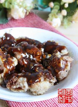 材料 A.鸡胸肉1/2块, B.葱末20克,姜末10克,蒜末40克,五香粉1/4茶匙,糖1大匙,味精1茶匙,酱油膏1大匙,小苏打1/4茶匙,水50CC,料理酒1大匙, C.炸...
